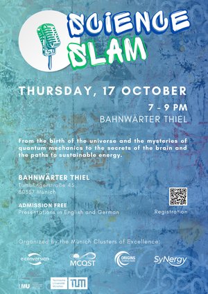 Fancy an evening full of science in a relaxed bar atmosphere? Join our Science Slam at Bahnwärter Thiel in Munich! A total of eight PhDs and postdocs from the four Munich Clusters of Excellence, e-conversion, MCQST, ORIGINS and SyNergy, share insights into Munich's cutting-edge research: from the birth of the universe to the mysteries of quantum mechanics to the secrets of the brain and the paths to sustainable energy. Expect an evening of captivating science talks - packed with flair and imagination. And the winner is...? The audience decides who wins.