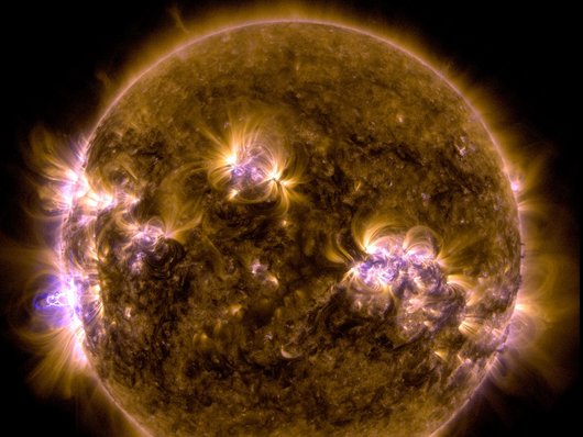 mehr dazuDie Sonnenoberfläche gleicht einem brodelnden Kessel aus heißem Plasma. Sonnenflecken – dunklere und kühlere Bereiche als der Rest der Oberfläche – kommen und gehen. In ihrer Nähe bilden sich riesige Plasma-Magnetfeldbögen. Gelegentlich schleudern magnetische Kurzschlüsse gewaltige Ströme geladener Teilchen und Energie in Richtung Erde. Etwa alle elf Jahre erreicht diese Aktivität ihren Höhepunkt…