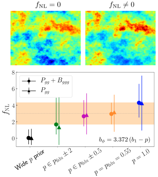 Naturally, if we wish to use observations of $\delta_g$ to constrain $f_{\rm NL}$ or $A_{\rm CIP}$, then we need to have a good understanding of the bias parameters. This understanding has been the focus of a series of papers of mine [2-6], in which I have used Separate Universe simulations of galaxy formation to predict the bias parameters, and then forecast the constraints that future surveys may be able to place on PNG and CIP. For example, in [3] I found that the expression $b_\phi = 3.372\left(b_1-p\right)$ with $p\approx 0.55$ seems to describe well the relation between the bias parameters of galaxies selected by their stellar mass, but the value of $p$ has some uncertainties and may vary accross different simulations; see Fig. 1. In another paper [6], I wished to determine the precision with which we should determine the value of $p$ in order to get robust constraints on PNG (i.e., on the parameter $f_{\rm NL}$) using galaxy observations. Figure 2 summarizes one of the main findings.In [2, 5], me and my collaborators carried out similar analyses for the case of CIP.