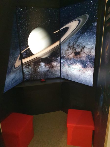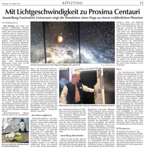 Der sonnennächste Nachbarstern Proxima Centauri befindet sich in einer Distanz von etwa vier Lichtjahren von uns. Die an ein Raumschiff anmutende Installation ermöglicht diese Reise, die in Wirklichkeit rund 75.000 Jahre dauern würde, in vier Minuten. Sie führt vorbei an unseren Planeten, Monden, Asteroiden und Weltraumteleskopen an den Rand unseres Sonnensystems und weiter, durch den interstellaren Raum, bis ins nächste Sternensystem zum Exoplaneten Proxima Centauri b. Das Exponat soll den Reisenden die Weite und Vielfalt des sonnennahen Universums nahebringen und erlebbar machen. Außerdem beinhaltet die Reise einen Blick auf unsere Erde aus großer Entfernung (vom Saturn aus), aus der die Erde nur als kleiner blauer Punkt erscheint. Diese Perspektive verschafft einen neuen Blickwinkel auf unseren Planeten und soll den Besuchenden der Ausstellung die Verletzlichkeit, aber auch die Einzigartigkeit unserer kosmischen Heimat vermitteln.