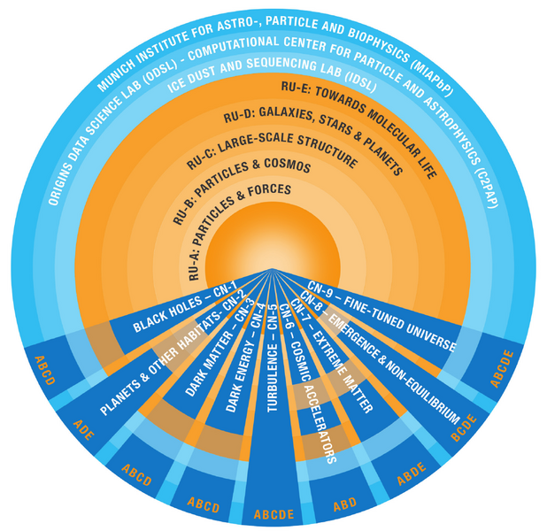 Der Exzellenzcluster ORIGINS untersucht die Entstehung des Weltalls und den Ursprung des Lebens. Der Forschungsverbund geht aus der sehr fruchtbaren Zusammenarbeit zwischen Astro-, Teilchen- und Kernphysik innerhalb des vorherigen Exzellenzclusters Universe hervor, der die grundlegenden Eigenschaften des Universums erforschte.